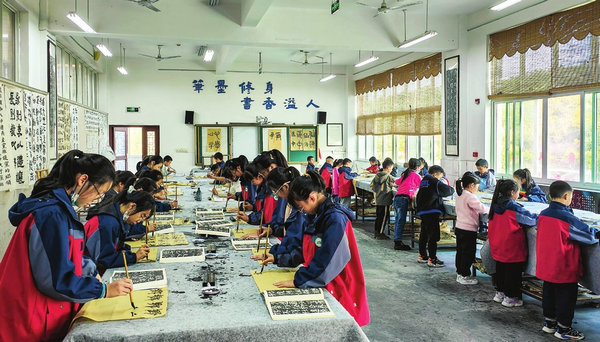 “學(xué)校書法教育之根本在于培養(yǎng)學(xué)生,在培訓(xùn)教師的同時(shí),學(xué)校書法教學(xué)以學(xué)生為本,制定年度書法教學(xué)計(jì)劃、書法教學(xué)中長(zhǎng)期規(guī)劃,定時(shí)間、分層次、重梯隊(duì)對(duì)學(xué)生進(jìn)行書法教育。”該校負(fù)責(zé)人何林表示,學(xué)校依托復(fù)興少年宮和課后延時(shí)服務(wù),在普及書法的基礎(chǔ)上,從各年級(jí)選拔有一定書法基礎(chǔ)和濃厚興趣的同學(xué)參加書法社團(tuán),目前社團(tuán)已達(dá)200余人。從2016年開始,學(xué)校推進(jìn)書法教學(xué)進(jìn)課堂,從小學(xué)一年級(jí)開始,學(xué)校免費(fèi)提供毛筆書寫工具和紙張,每周在地方課程中開設(shè)一節(jié)書法課,讓學(xué)生系統(tǒng)學(xué)習(xí)書法基礎(chǔ)知識(shí)。此外,每周星期一、三下午正課前20分鐘,全校學(xué)生集中練習(xí)硬筆書法,全程由語文老師指導(dǎo),做到軟筆與硬筆、理論與實(shí)踐結(jié)合。學(xué)校書法教育先后被央視“焦點(diǎn)訪談”、四川衛(wèi)視等多家媒體報(bào)道。俄羅斯青少年代表團(tuán)蒞臨學(xué)校進(jìn)行書畫交流,中央文明辦、省文明辦先后組織全國(guó)、全省鄉(xiāng)村少年宮學(xué)校代表5000余人到校參觀。