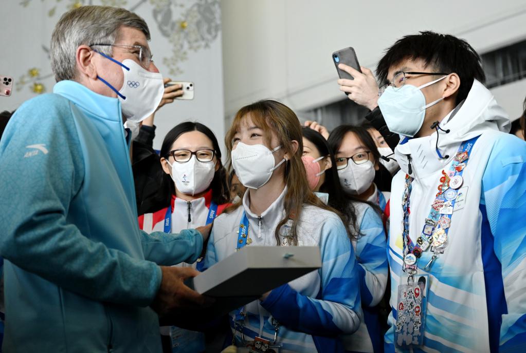 2月18日,國(guó)際奧委會(huì)主席巴赫來到北京2022年冬奧會(huì)主媒體中心,與志愿者交流互動(dòng)。新華社記者李一博攝