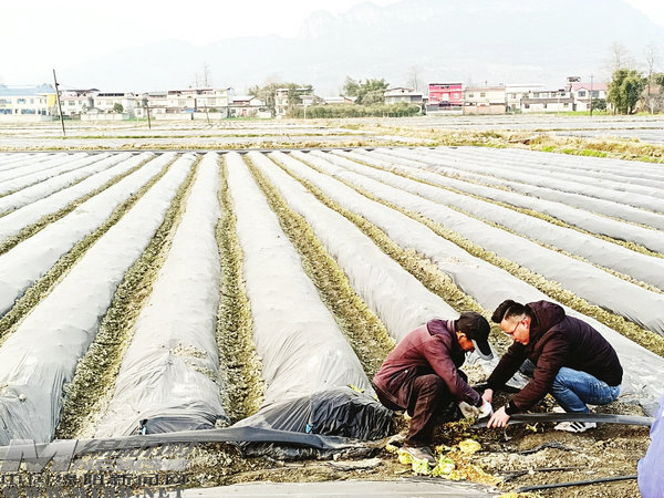 楊維明(右)查看農(nóng)作物長(zhǎng)勢(shì)