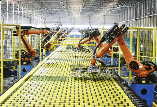 如今,我國已轉向高質量發(fā)展階段,科技創(chuàng)新已經成為建設創(chuàng)新型國家的關鍵要素和依靠力量。站在新的歷史起點上,我們要堅定創(chuàng)新自信,努力實現高水平科技自立自強,以一往無前的奮進姿態(tài),向著科技強國建設的目標闊步前進。圖為在福建省福清市的福耀玻璃集團汽車玻璃生產車間,機械手在生產線上作業(yè)。(據新華社)