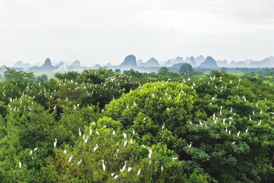2022年全國兩會期間,代表委員們圍繞持續(xù)改善生態(tài)環(huán)境,推動綠色低碳發(fā)展建言獻策,為建設美麗中國貢獻智慧力量。圖為鷺鳥在廣西桂林市臨桂區(qū)四塘鎮(zhèn)王家村棲息。