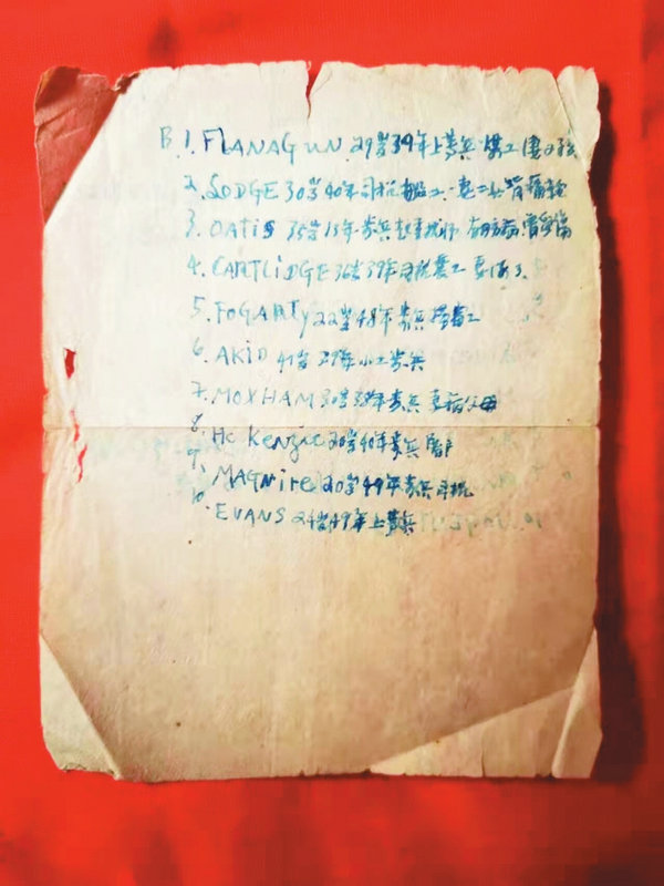 這是用白雪和紅血浸寫的一本日記。2022年清明前夕,我無意中翻出了已故哥哥伍丕治以前寄給我的數(shù)十封信和一本日記。日記本是藍(lán)色的布面封皮,歷經(jīng)70多年,依舊保存完好。封皮的藍(lán)色早已褪去,但還能認(rèn)得是1949年前印制的日記本,本內(nèi)壓著兩張小字條,字條上寫有三組30個(gè)被俘美軍英軍名單。日記本正頁頁面上的字體顯得雋秀有力。有著259頁日記的頁面因年代久遠(yuǎn),字跡大部分都看不清了,僅有40個(gè)頁面還能認(rèn)出部分內(nèi)容。只要能看清的,我都細(xì)細(xì)地看,認(rèn)真品讀。沿著他日記上記載的時(shí)間和足跡,我追尋著志愿軍梁山部(五十軍戰(zhàn)時(shí)代號(hào))那支英雄部隊(duì)的足跡。仿佛看到他們打過三八線、消滅英軍皇家重坦克營、攻進(jìn)漢城、阻敵漢江,斃敵11000多名,活捉美軍英軍俘虜61名的情景。名單上那30個(gè)有名有姓、入伍前從事某種職業(yè)的美軍士兵和英軍士兵正是其中的一部分俘虜。