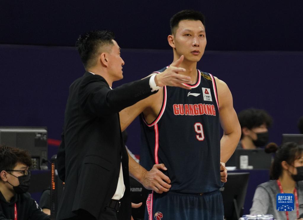 4月7日,廣東東莞大益隊主教練杜鋒向球員易建聯(lián)(右)講解戰(zhàn)術(shù)。