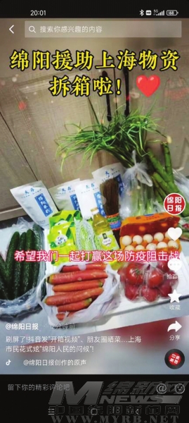 上海市民陸續(xù)收到“來(lái)自綿陽(yáng)人民的問(wèn)候”,整整一箱的物資讓大家激動(dòng)不已,不少網(wǎng)友通過(guò)抖音、微博等平臺(tái)發(fā)布“開(kāi)箱視頻”,曬出“禮包”,感謝綿陽(yáng)人民的用心和關(guān)心。