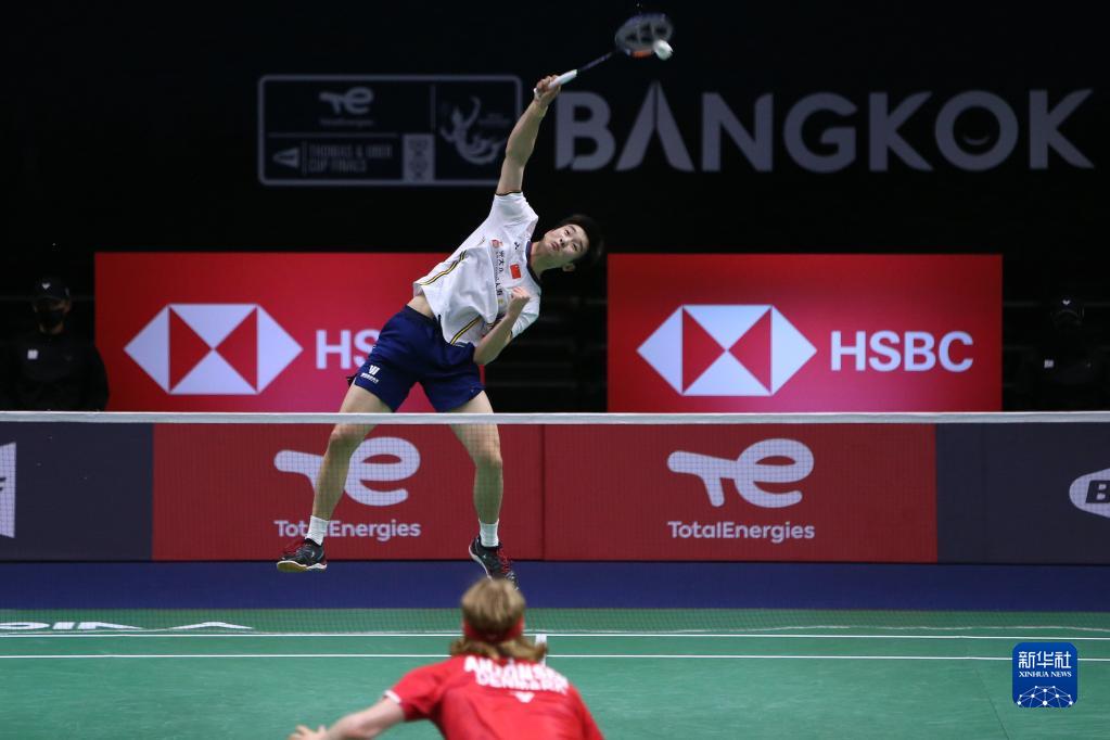 5月11日,中國(guó)隊(duì)選手李詩(shī)灃在比賽中回球。他在男單比賽中以2比1戰(zhàn)勝丹麥隊(duì)選手安東森。新華社記者 王騰 攝