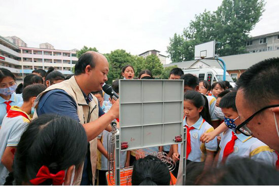 2輛“科普大篷車”,30多件科普展品,還有知識點滿滿的科普小課堂,讓同學們大開眼界。同學們或駐足觀看,或動手操作,探討聲、驚嘆聲此起彼伏。