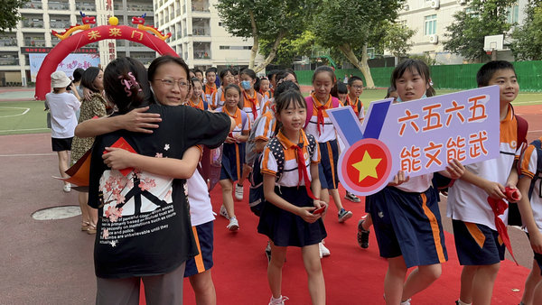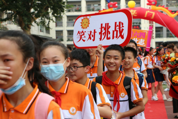 下午17:00許,畢業(yè)典禮開始。學生為老師們獻上鮮花,老師為學生們頒發(fā)畢業(yè)證。“六一六一,自強不息!”“六二六二,獨一無二!”……各班學生們喊著口號,有序走過“未來門”,和老師做最后的告別。一些學生和恩師互相擁抱,揮淚告別。