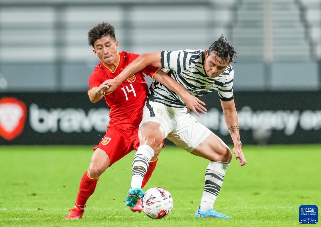 7月20日,中國(guó)男足選拔隊(duì)球員陳國(guó)抗(左)與韓國(guó)隊(duì)球員宋旼奎在比賽中拼搶。新華社記者 張笑宇 攝