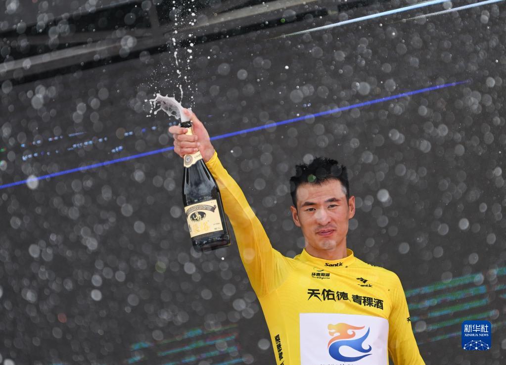 7月31日,平潭國(guó)際旅游島洲際隊(duì)選手劉建坤身著代表個(gè)人總成績(jī)第一名的黃色領(lǐng)騎衫在領(lǐng)獎(jiǎng)臺(tái)上慶祝。