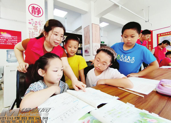 近日,在經(jīng)開區(qū)塘汛街道三江社區(qū)海賦長興小區(qū)黨支部內(nèi),“愛心暑期托管班”的孩子在志愿者的幫助下學(xué)習(xí)。(綿報融媒記者 陳冬冬 攝)
