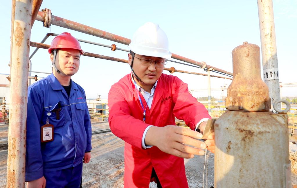 圖為陳亞鵬(右)與化工企業(yè)員工一起檢查生產(chǎn)設(shè)備。