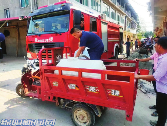 鹽亭縣消防救援大隊(duì)為群眾送水。(綿報(bào)融媒記者 任明勇 攝)