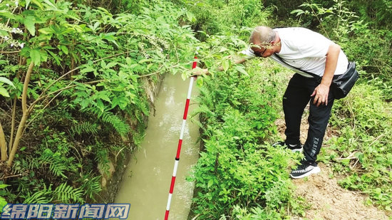 綿陽(yáng)武引管理局工作人員測(cè)量灌區(qū)水位,檢查供水情況。(綿報(bào)融媒實(shí)習(xí)記者 王儻 攝)