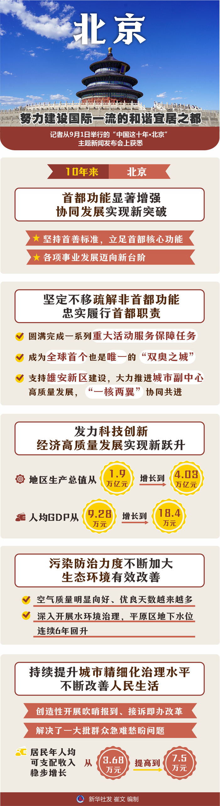 新華社北京9月1日電(記者王君璐)記者從1日舉行的“中國這十年·北京”主題新聞發(fā)布會上獲悉,黨的十八大以來,北京深入貫徹落實(shí)習(xí)近平總書記重要指示精神,全市上下牢記囑托、勇?lián)姑?,全面貫徹新發(fā)展理念,融入新發(fā)展格局,求真務(wù)實(shí)、砥礪奮進(jìn),努力建設(shè)國際一流的和諧宜居之都,在全面建設(shè)社會主義現(xiàn)代化國家新征程上奮力譜寫首都發(fā)展新篇章。