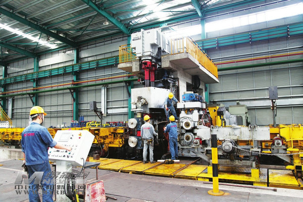 伴隨著“咚咚咚”的鍛打聲,六合特材車間內一派忙碌的景象,一塊紅彤彤的鋼錠正在6000噸快鍛機上鍛壓……