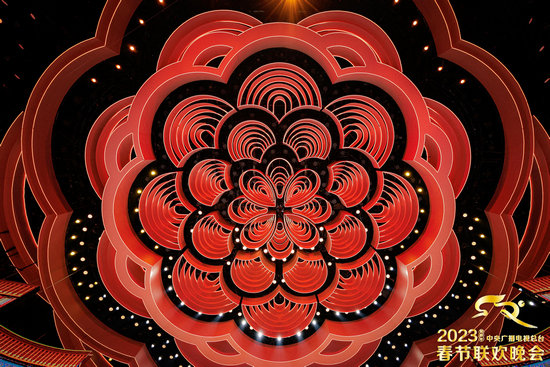 2023年春晚舞美設(shè)計(jì)體現(xiàn)“滿庭芳”的理念,取意自中國(guó)古典文學(xué)詞牌名,通過演播大廳多個(gè)方位的設(shè)計(jì),共同營(yíng)造祈愿圓“滿”的中華大家“庭”盡展“芳”華的主題氣象。其中,由四瓣花結(jié)構(gòu)演化重構(gòu)而成的演播廳頂部藝術(shù)裝置,既是根植于中華文明的美學(xué)創(chuàng)造,又是綻放著現(xiàn)代設(shè)計(jì)理念的創(chuàng)新呈現(xiàn)。創(chuàng)意取材自距今6000年至4800年前的廟底溝彩陶標(biāo)志性的“花瓣紋”,著名考古學(xué)家蘇秉琦先生曾提出:花卉圖案彩陶,可能就是華族(即華夏民族)得名的由來。