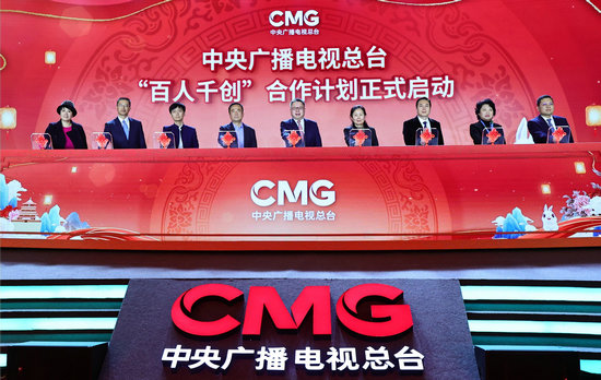 云發(fā)布活動現場,彭健明與總臺創(chuàng)新發(fā)展研究中心召集人楊華,總經理室常務副召集人任學安,中廣影視衛(wèi)星有限責任公司董事長、總經理黃瑞剛,文藝節(jié)目中心常務副召集人許文廣,視聽新媒體中心副召集人俞勤,央視頻融媒體發(fā)展有限公司總經理、央視國際網絡有限公司黨委書記、董事長過彤,中廣視資產管理有限公司總經理韓峰,2023年總臺春節(jié)聯歡晚會總導演于蕾共同啟動了總臺“百人千創(chuàng)”合作計劃。