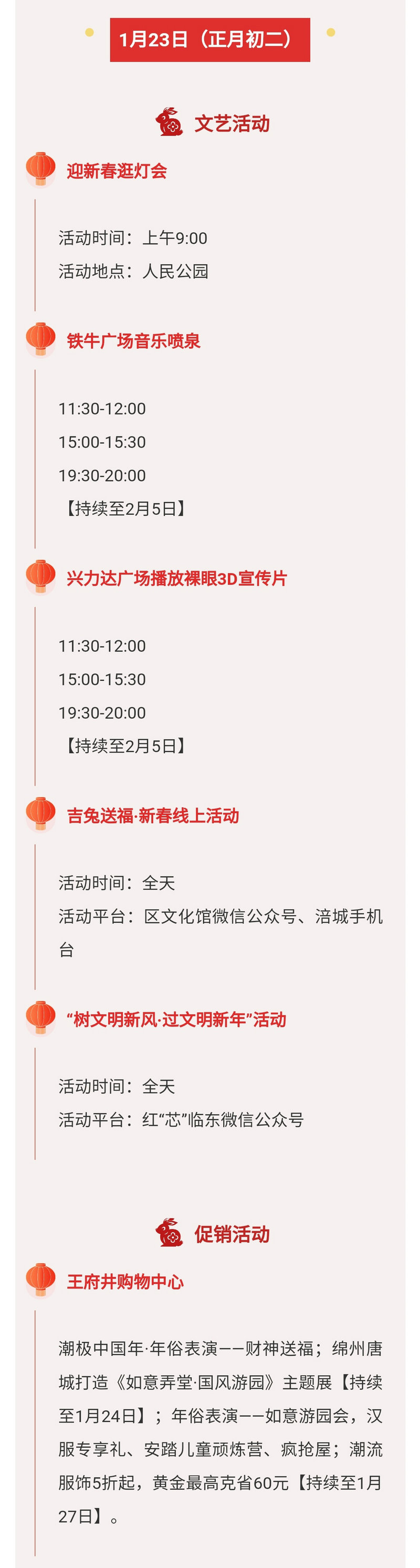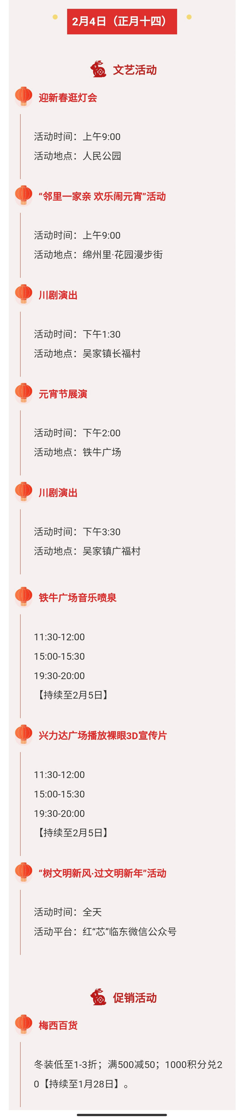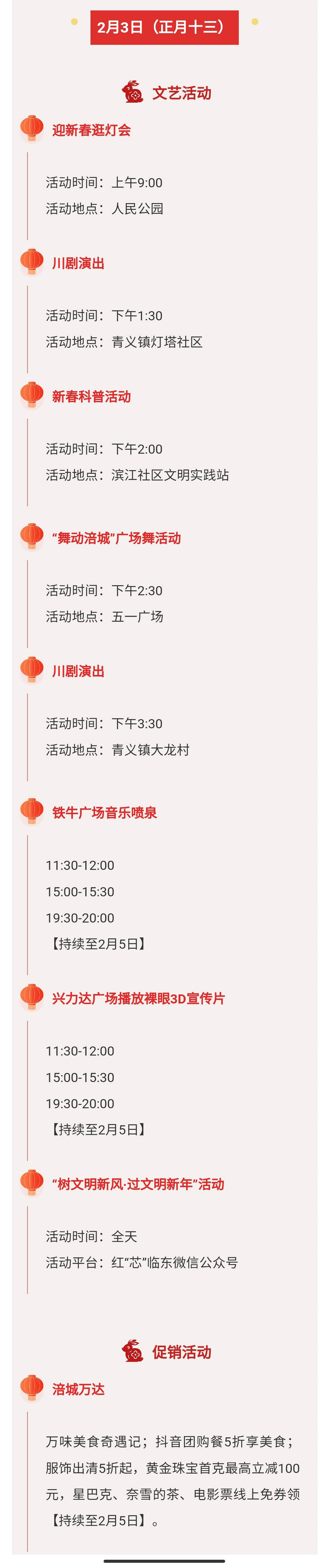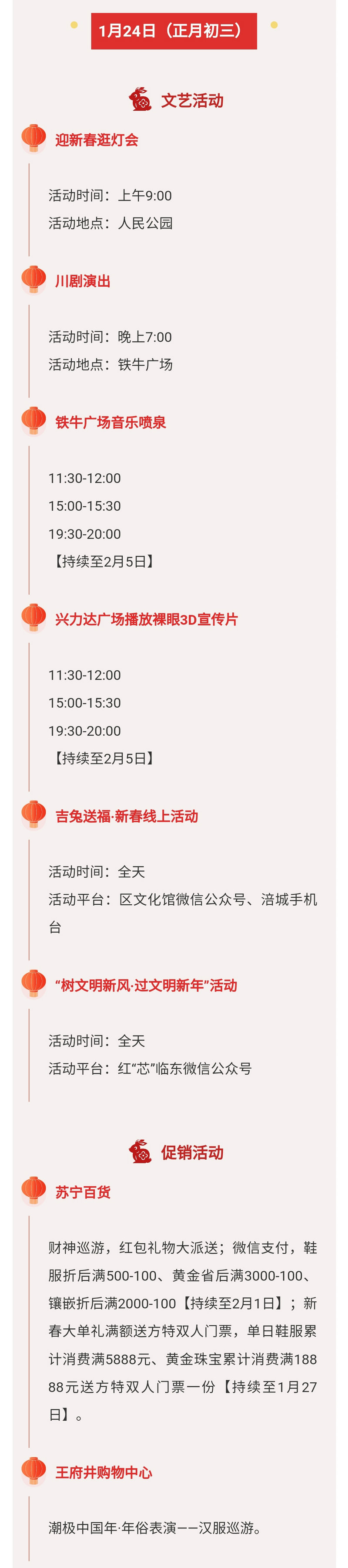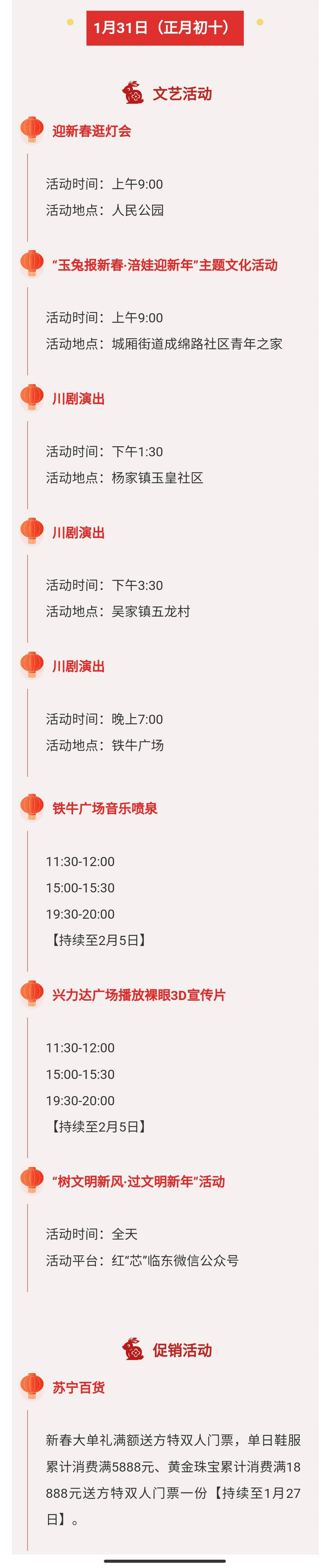 迎新春逛燈會(huì)、年貨市集、川劇演出、裸眼3D宣傳片……涪城區(qū)相關(guān)負(fù)責(zé)人表示,這次新春佳節(jié)期間,涪城區(qū)多個(gè)商圈的商場(chǎng)、購(gòu)物中心都有促銷(xiāo)活動(dòng),還有一大波文化活動(dòng),讓市民朋友一起感受濃濃的年味,嗨翻新春。