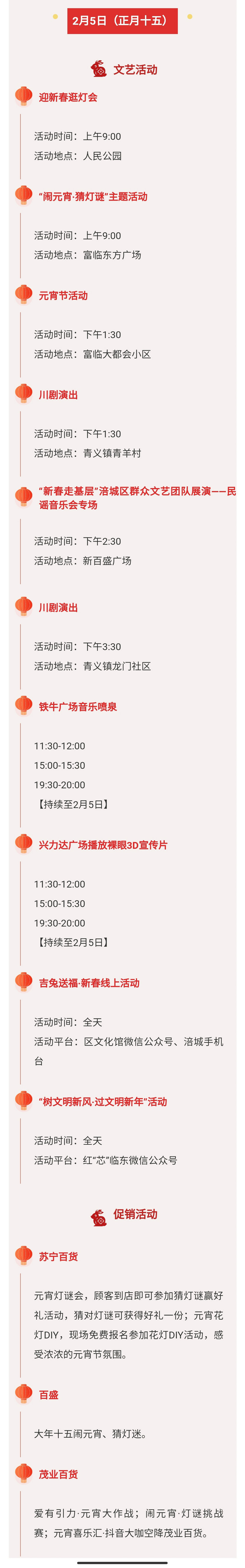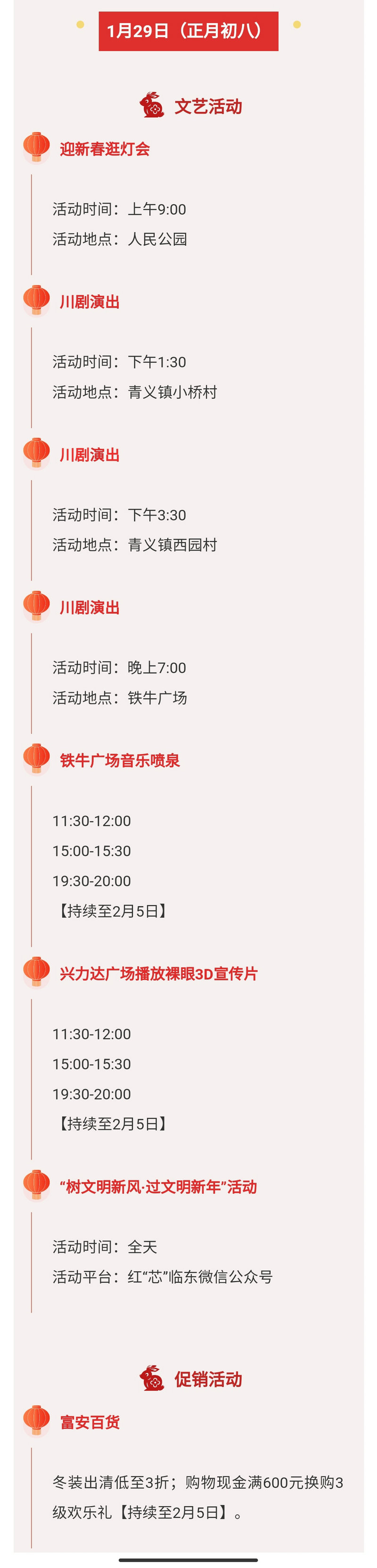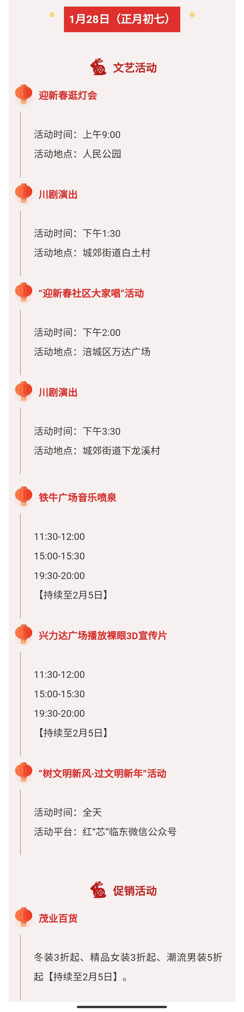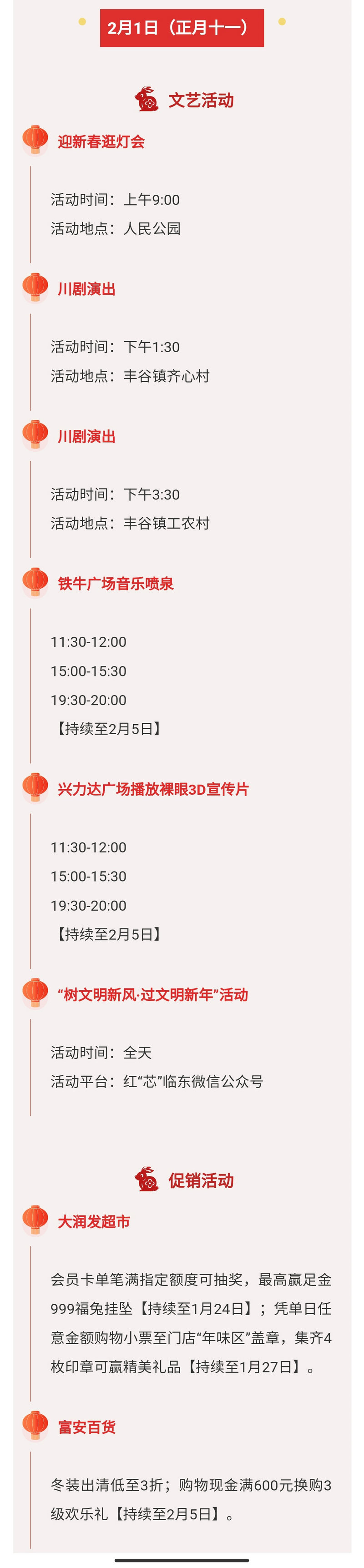 迎新春逛燈會(huì)、年貨市集、川劇演出、裸眼3D宣傳片……涪城區(qū)相關(guān)負(fù)責(zé)人表示,這次新春佳節(jié)期間,涪城區(qū)多個(gè)商圈的商場(chǎng)、購(gòu)物中心都有促銷(xiāo)活動(dòng),還有一大波文化活動(dòng),讓市民朋友一起感受濃濃的年味,嗨翻新春。