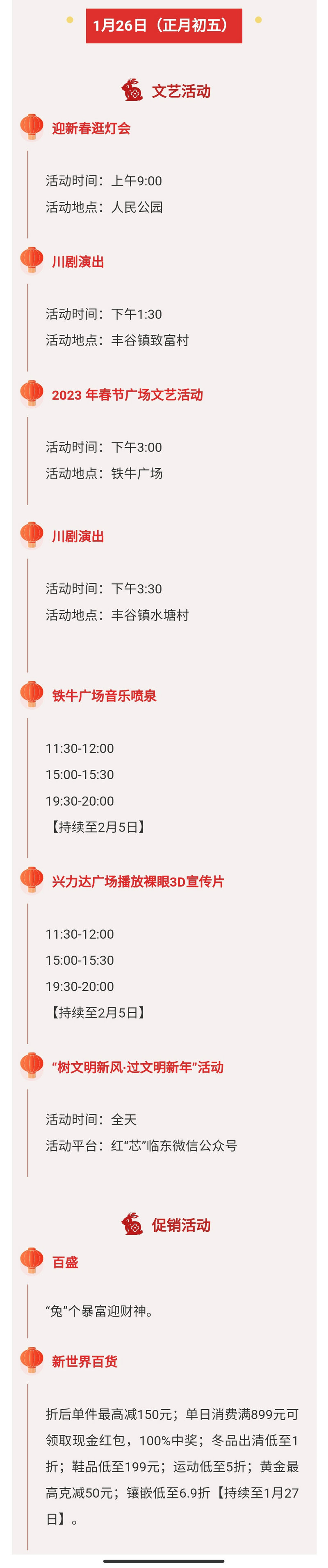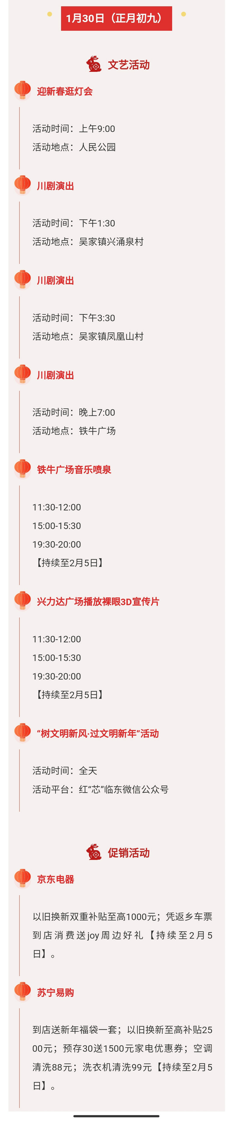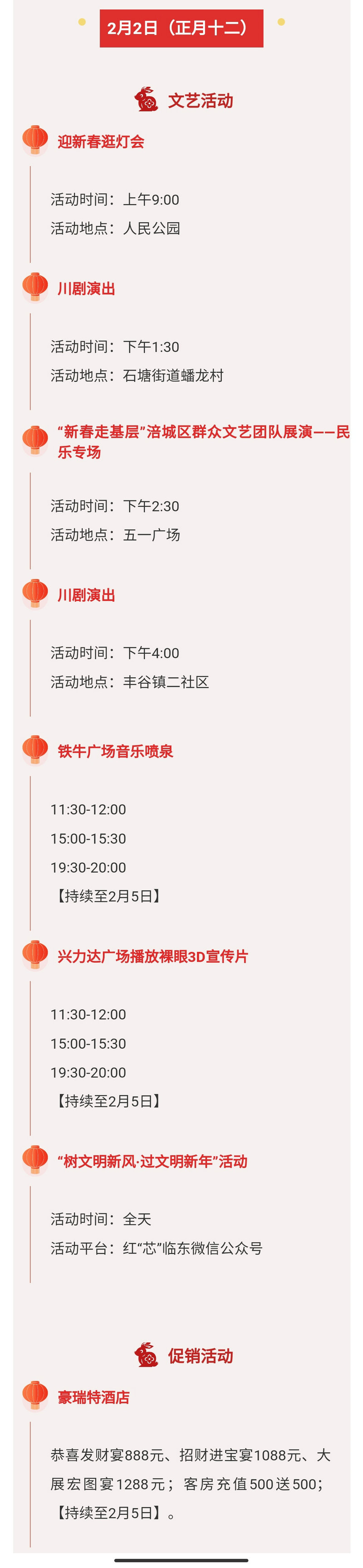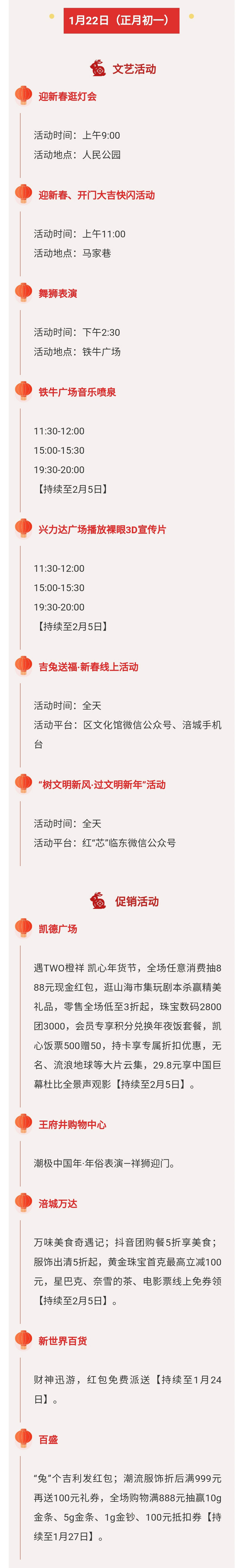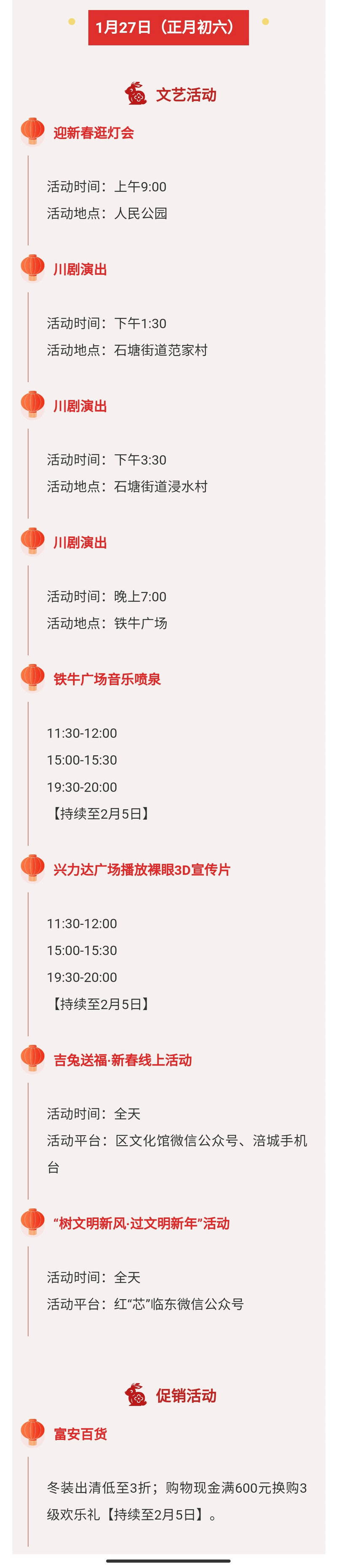 迎新春逛燈會(huì)、年貨市集、川劇演出、裸眼3D宣傳片……涪城區(qū)相關(guān)負(fù)責(zé)人表示,這次新春佳節(jié)期間,涪城區(qū)多個(gè)商圈的商場(chǎng)、購(gòu)物中心都有促銷(xiāo)活動(dòng),還有一大波文化活動(dòng),讓市民朋友一起感受濃濃的年味,嗨翻新春。