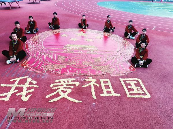 9月29日上午,在江油市長城實(shí)驗(yàn)學(xué)校操場上,隨著一幅寬大的紅綢徐徐展開。該校布拖班的全體學(xué)生爭先恐后用事先準(zhǔn)備好的金黃玉米粒,依照紅綢上的圖案線條忙碌起來。約1小時(shí)后,紅綢中央便呈現(xiàn)出一枚偌大的國徽造型圖案,下面用玉米粒鑲嵌四個(gè)大字:“我愛祖國”(如圖)。看著這幅特別的“糧食畫”,大家禁不住歡呼雀躍!
