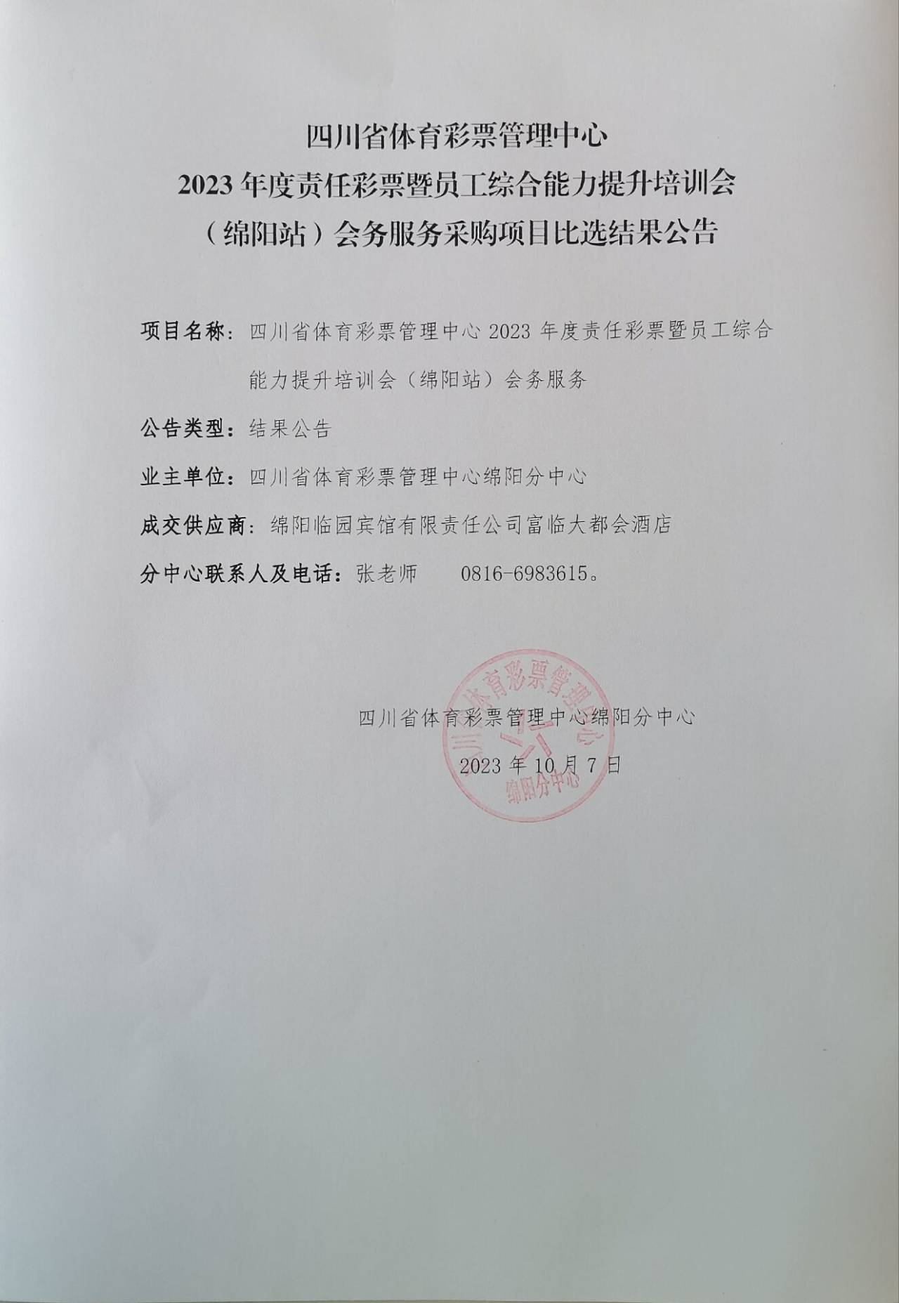 四川省體育彩票管理中心2023年度責(zé)任彩票暨員工綜合能力提升培訓(xùn)會(綿陽站)會務(wù)服務(wù)采購項目比選結(jié)果公告