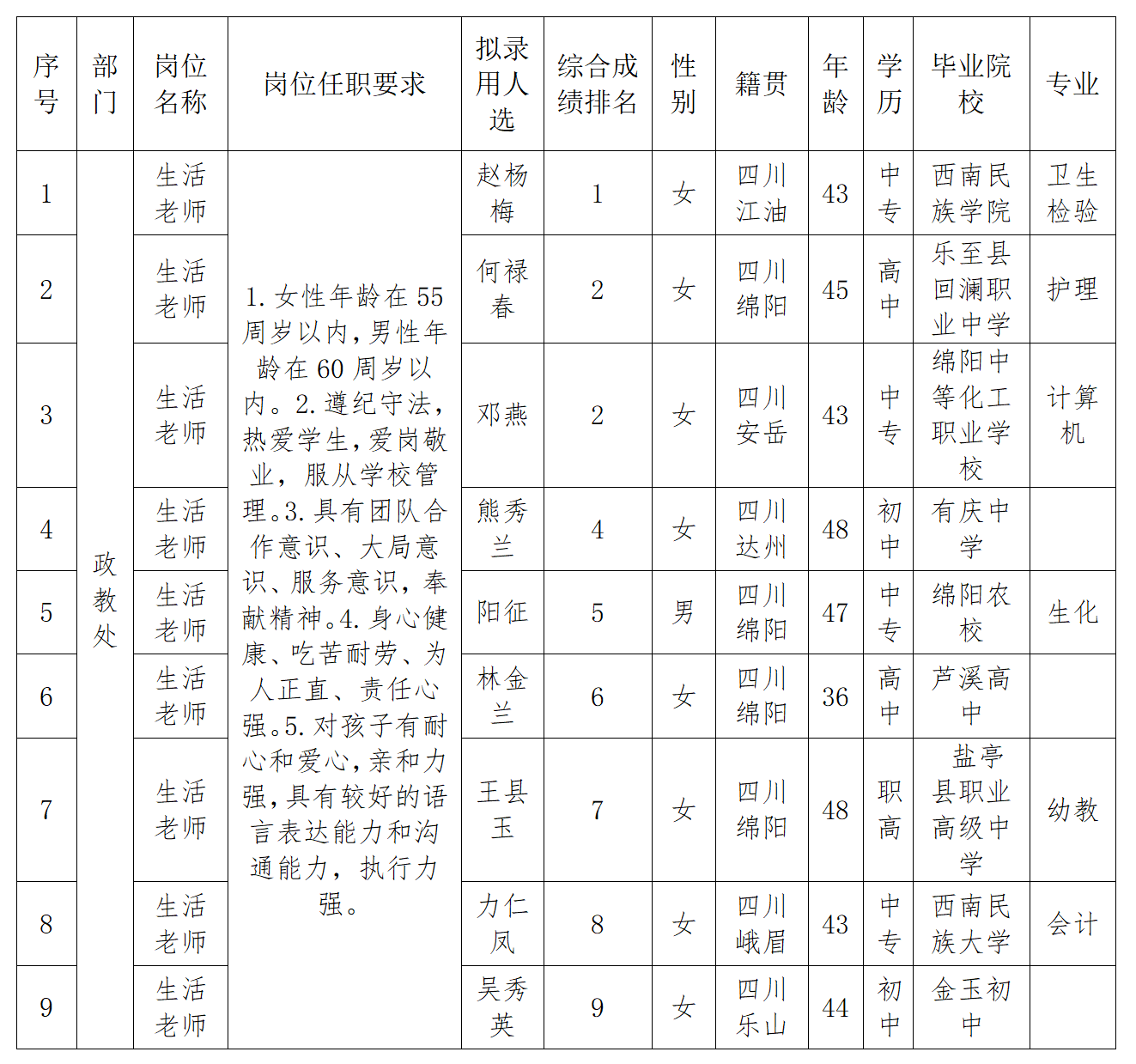 根據(jù)綿陽南山中學(xué)實驗學(xué)校發(fā)布的招聘公告及招聘相關(guān)規(guī)定,經(jīng)面試、考察、體檢等程序,擬錄用趙楊梅等9位同志到綿陽南山中學(xué)實驗學(xué)校工作,現(xiàn)予以公示,具體情況如下: