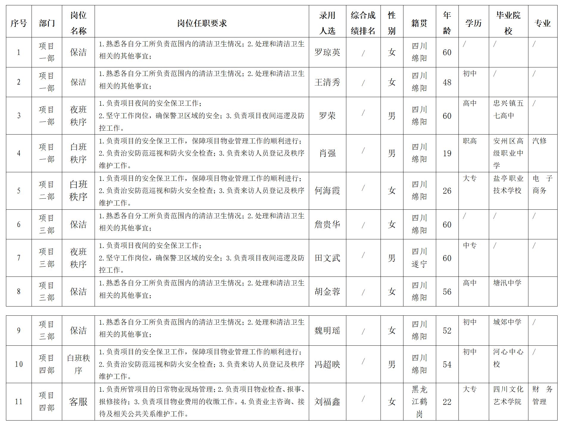 根據(jù)綿陽市康來物業(yè)服務(wù)有限公司發(fā)布的招聘公告及招聘相關(guān)規(guī)定,經(jīng)面試、試用等程序,擬錄用以下人員到綿陽市康來物業(yè)服務(wù)有限公司各項目部工作,現(xiàn)予以公示,具體情況如下: