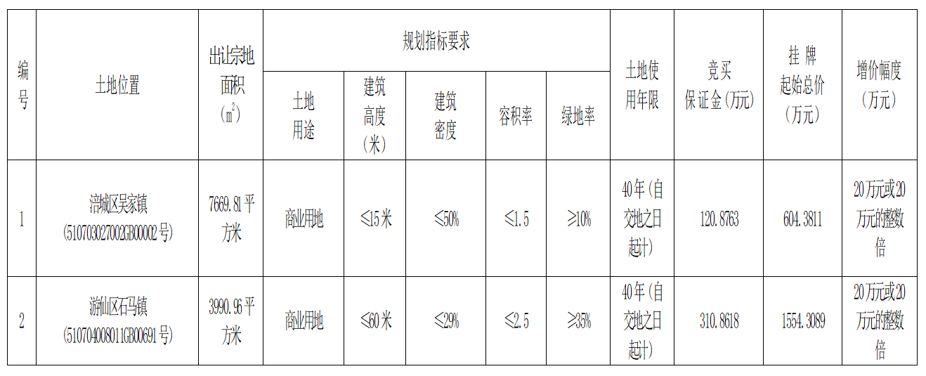 上述兩宗地以現狀出讓,1號宗地其他規(guī)劃要求詳見綿自然資規(guī)設〔2023〕213號;2號宗地其他規(guī)劃要求詳見(綿自然資規(guī)設〔2022〕125-2號)及《規(guī)劃審查意見》(綿自然資規(guī)審〔2023〕574號)。