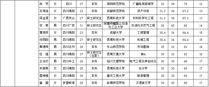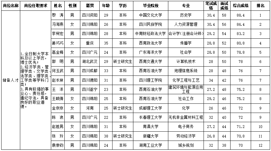 根據(jù)綿陽燃氣集團有限公司發(fā)布的招聘公告及招聘相關(guān)規(guī)定,經(jīng)筆試、面試等程序,現(xiàn)將綜合成績予以公示。