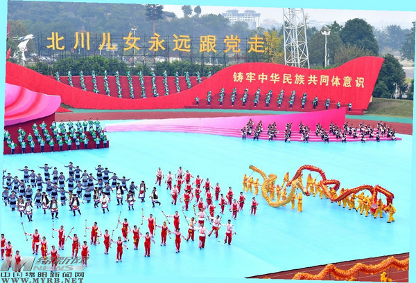 綿陽(yáng)新聞網(wǎng)訊 10月25日,北川羌族自治縣體育中心,八方賓朋齊聚在一起,現(xiàn)場(chǎng)儼然是一片歡樂(lè)的海洋。北川羌族自治縣成立20周年慶祝大會(huì)在這進(jìn)行,整個(gè)慶祝大會(huì)由2023名參演人員組成的20支巡游隊(duì)拉開(kāi)帷幕。隨后,歌舞《禹魂》《各族兒女手拉手》《北川人民感黨恩》《羌山兒女》、情景歌舞《英雄》《錦繡小康》等文化展演節(jié)目精彩上演(如圖),充分展示了各民族群眾共同團(tuán)結(jié)進(jìn)步、共同繁榮發(fā)展的輝煌業(yè)績(jī),讓觀眾感受到了北川深厚的禹羌文化底蘊(yùn)。