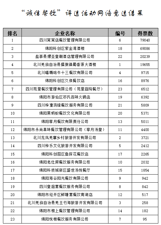 按照《綿陽市“誠信商超(酒店、餐飲)”評選活動方案》,2023年10月14日00:00:00至10月20日23:59:59,開展了“誠信商超(酒店、餐飲)”網(wǎng)絡(luò)競選,現(xiàn)將結(jié)果進(jìn)行公示。