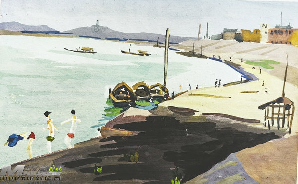 一輪紅日躍出云層,霞光映照在粼粼江面,對岸若隱若現的造船廠、晨光薄霧中的遠山,與近處岸邊的貨運碼頭、江邊洗衣服的大姐大媽們,形成一幅絕美的畫面。王裕谷忍不住心中一喜,趕緊拿出畫筆勾勒起來。