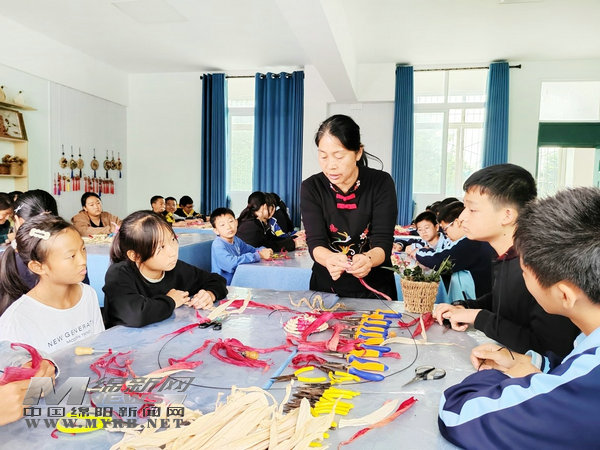 在另一間教室里,同學(xué)們正跟隨“江油草編”代表性傳承人何桂容學(xué)習(xí)草編技藝。“草編的原材料就在我們身邊,取之不盡用之不竭……希望大家學(xué)好草編,個(gè)個(gè)都成為‘變廢為寶’的環(huán)保達(dá)人。”何桂容隨手拾起一絲棕葉,向同學(xué)們示范草編的基本技法。她將手里的棕葉壓扁,多根結(jié)合層層編扣,巧手舞動(dòng)中,一只活靈活現(xiàn)的小動(dòng)物便呈現(xiàn)在大家眼前。