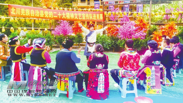 北川志愿服務(wù)總隊在青片鄉(xiāng)西窩羌寨開展黨的二十大精神文藝宣講活動