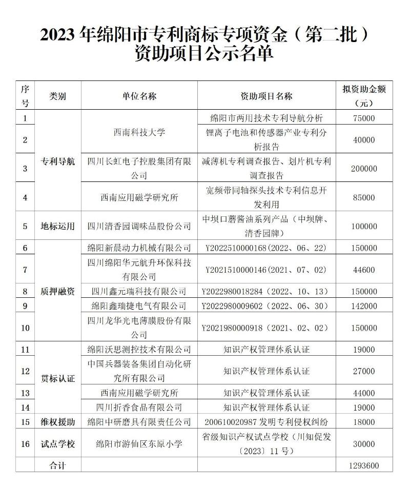 根據(jù)《綿陽市專利商標(biāo)專項(xiàng)資金管理辦法》(綿市監(jiān)發(fā)〔2022〕138號(hào))、《綿陽市專利商標(biāo)專項(xiàng)資金管理辦法實(shí)施細(xì)則》(綿市監(jiān)發(fā)〔2023〕49號(hào))精神,以及《關(guān)于申報(bào)2023年綿陽市專利商標(biāo)專項(xiàng)資金資助的通知》(綿知促發(fā)〔2023〕6號(hào))要求,經(jīng)項(xiàng)目單位申報(bào)、縣(市區(qū))園區(qū)初審、綿陽市知識(shí)產(chǎn)權(quán)促進(jìn)服務(wù)中心復(fù)審,專家評(píng)審等程序,確定2023年綿陽市專利商標(biāo)專項(xiàng)資助項(xiàng)目(第二批)16個(gè),資助金額129.36萬元(具體項(xiàng)目見附件),現(xiàn)予以公示,征求社會(huì)各界意見,接受社會(huì)監(jiān)督。