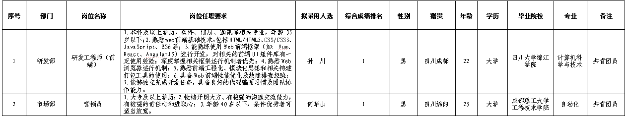根據(jù)綿陽能創(chuàng)科技有限責(zé)任公司發(fā)布的招聘公告及招聘相關(guān)規(guī)定,經(jīng)筆試、面試、考察、體檢等程序,擬錄用以下兩名同志到綿陽能創(chuàng)科技有限責(zé)任公司工作,現(xiàn)予以公示,具體情況如下: