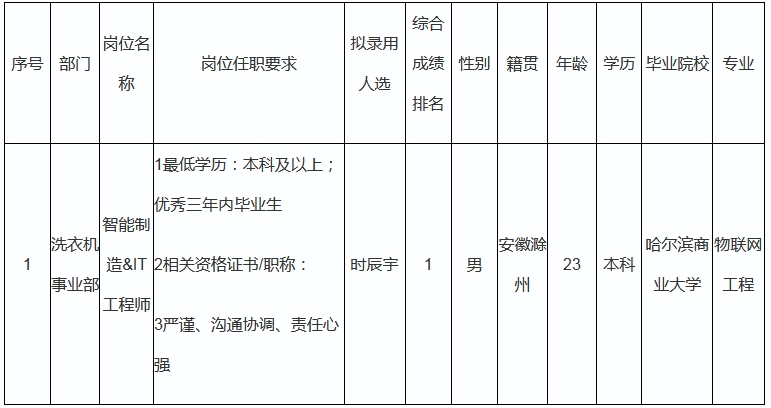 根據(jù)長虹美菱股份有限公司發(fā)布的招聘公告及招聘相關(guān)規(guī)定,經(jīng)筆試、面試、考察、體檢等程序,擬錄用時(shí)辰宇同志到洗衣機(jī)事業(yè)部部門工作,現(xiàn)予以公示,具體情況如下: