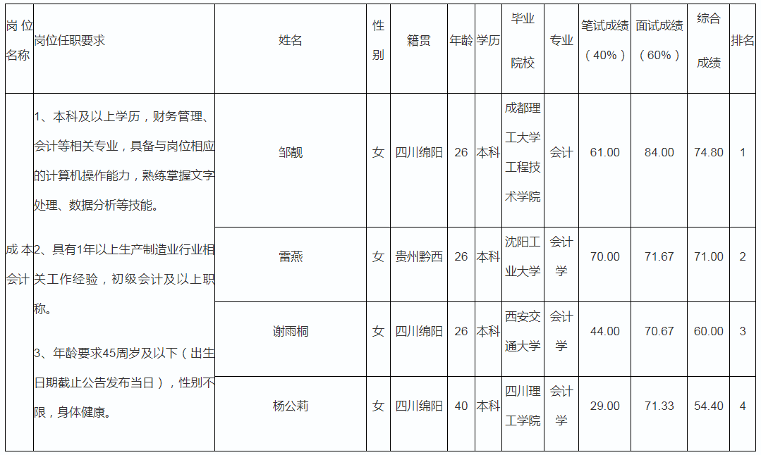 根據(jù)中國重汽集團(tuán)綿陽專用汽車有限公司發(fā)布的招聘公告及招聘相關(guān)規(guī)定,經(jīng)筆試、面試程序,現(xiàn)將筆試、面試成績予以公示。