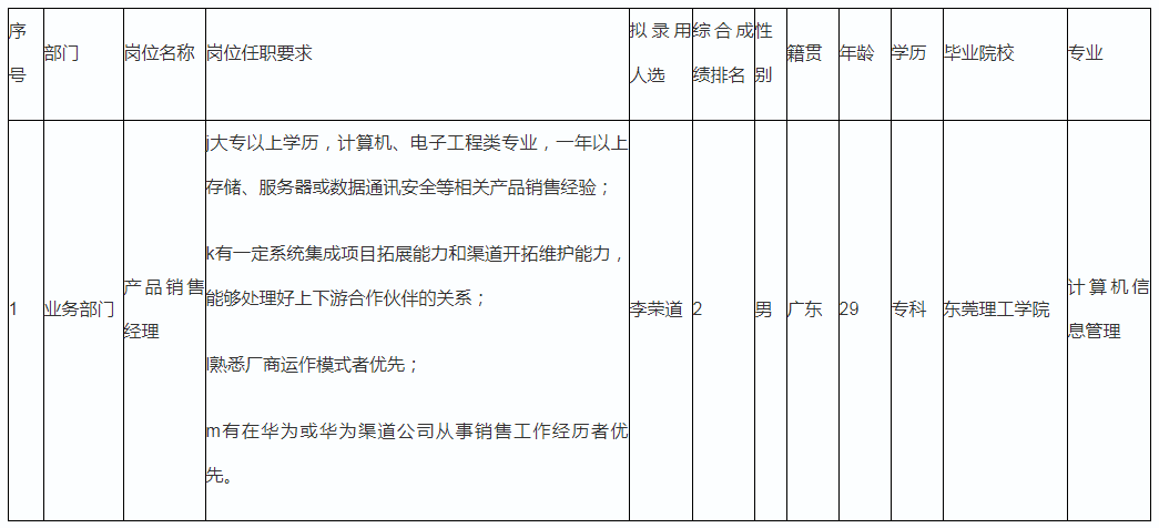 根據(jù)四川長虹佳華信息產品有限責任公司發(fā)布的招聘公告及招聘相關規(guī)定,經筆試、面試、考察、體檢等程序,擬錄用李榮道同志到四川長虹佳華信息產品有限責任公司工作,現(xiàn)予以公示,具體情況如下: