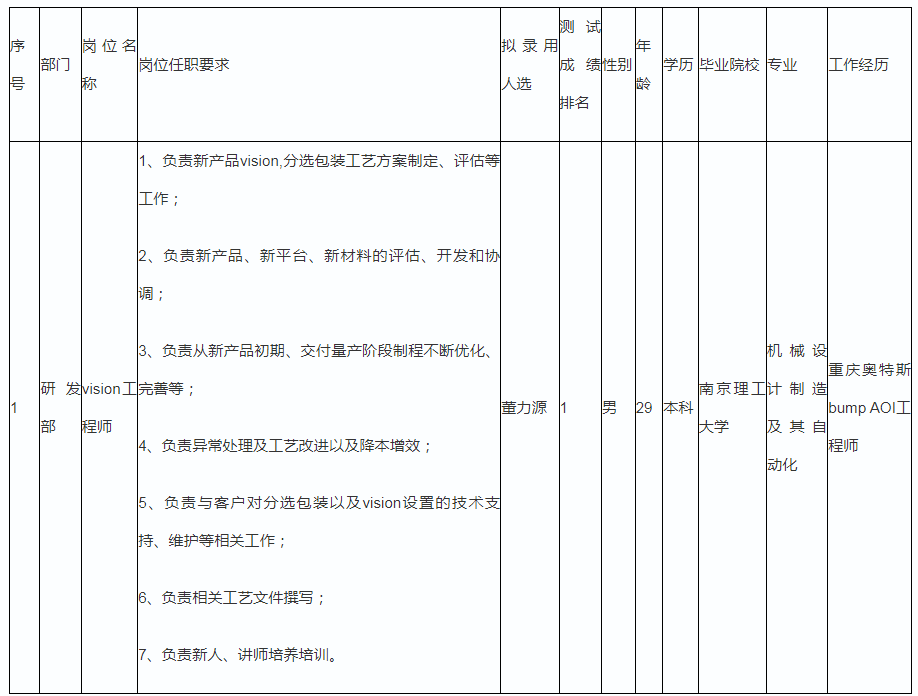 根據(jù)四川啟賽微電子有限公司發(fā)布的招聘公告及招聘相關(guān)規(guī)定,經(jīng)用人單位面試,擬錄用以下同志到相應(yīng)崗位工作,現(xiàn)予以公示,具體情況如下: