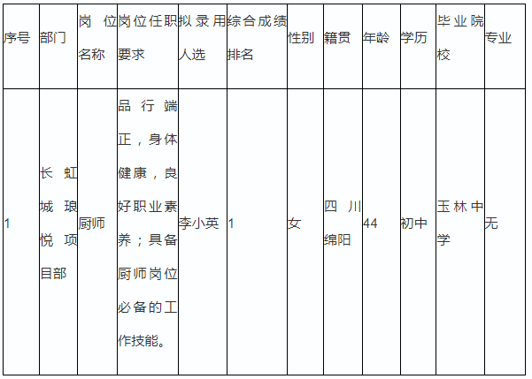 根據(jù)四川虹尚建筑工程有限公司發(fā)布的招聘公告及招聘相關(guān)規(guī)定,經(jīng)面試、考察、體檢等程序,擬錄用李小英同志到項(xiàng)目部廚師崗位工作,現(xiàn)予以公示,具體情況如下: