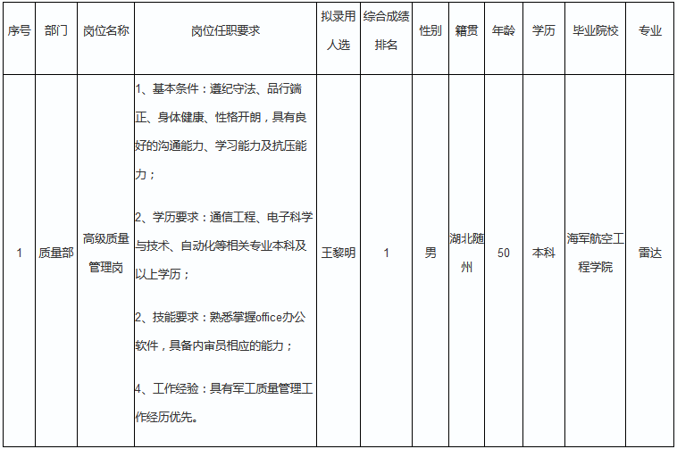 根據(jù)成都九洲迪飛科技有限責(zé)任公司發(fā)布的招聘公告及招聘相關(guān)規(guī)定,經(jīng)筆試、面試、考察、體檢等程序,擬錄用王黎明同志到成都九洲迪飛科技有限責(zé)任公司工作,現(xiàn)予以公示,具體情況如下:
