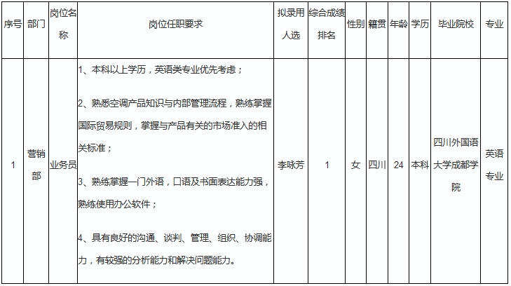 根據(jù)中山長虹電器有限公司發(fā)布的招聘公告及招聘相關(guān)規(guī)定,經(jīng)筆試、面試、考察、體檢等程序,擬錄用李詠芳同志到業(yè)務(wù)員工作,現(xiàn)予以公示,具體情況如下: