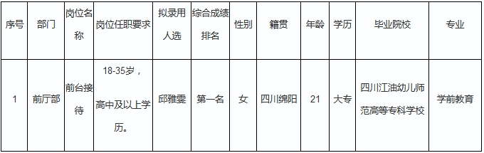 根據(jù)綿陽(yáng)市綿州嘉來(lái)會(huì)務(wù)服務(wù)有限公司發(fā)布的招聘公告及招聘相關(guān)規(guī)定,經(jīng)面試、體檢等程序,錄用邱雅雯同志到綿陽(yáng)市綿州嘉來(lái)會(huì)務(wù)服務(wù)有限公司前廳部工作,現(xiàn)予以公示,具體情況如下: