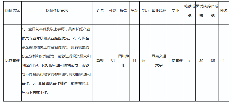 根據(jù)四川長虹網(wǎng)絡科技有限責任公司發(fā)布的招聘公告及招聘相關規(guī)定,經筆試、面試等程序,現(xiàn)將筆試(面試)成績予以公示。