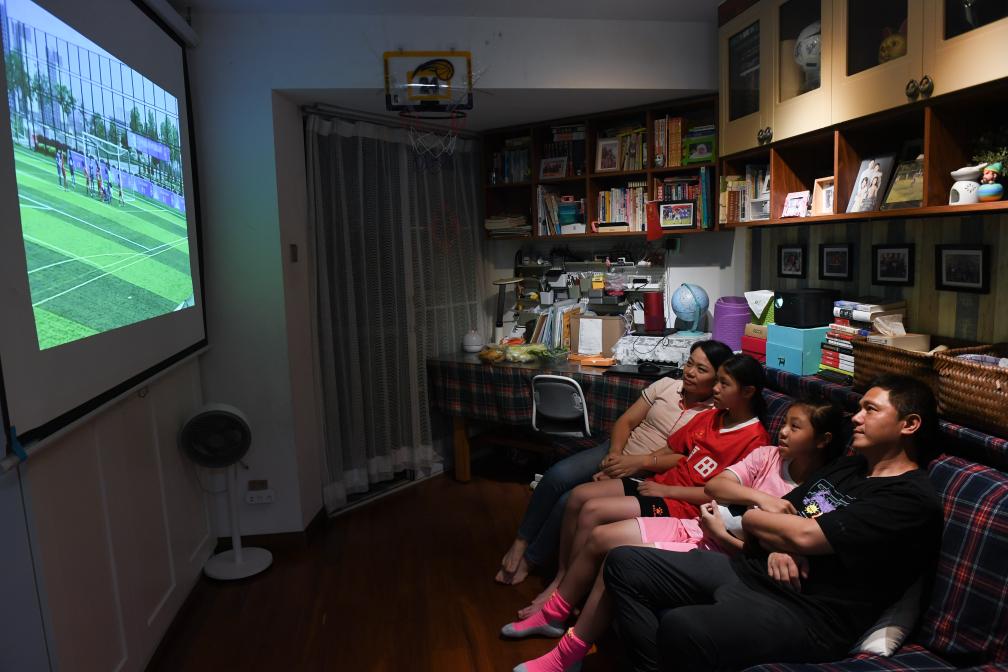 5月11日,練昱彤(右二)和爸爸媽媽以及妹妹在深圳的家中一起回看比賽視頻。新華社記者 毛思倩 攝