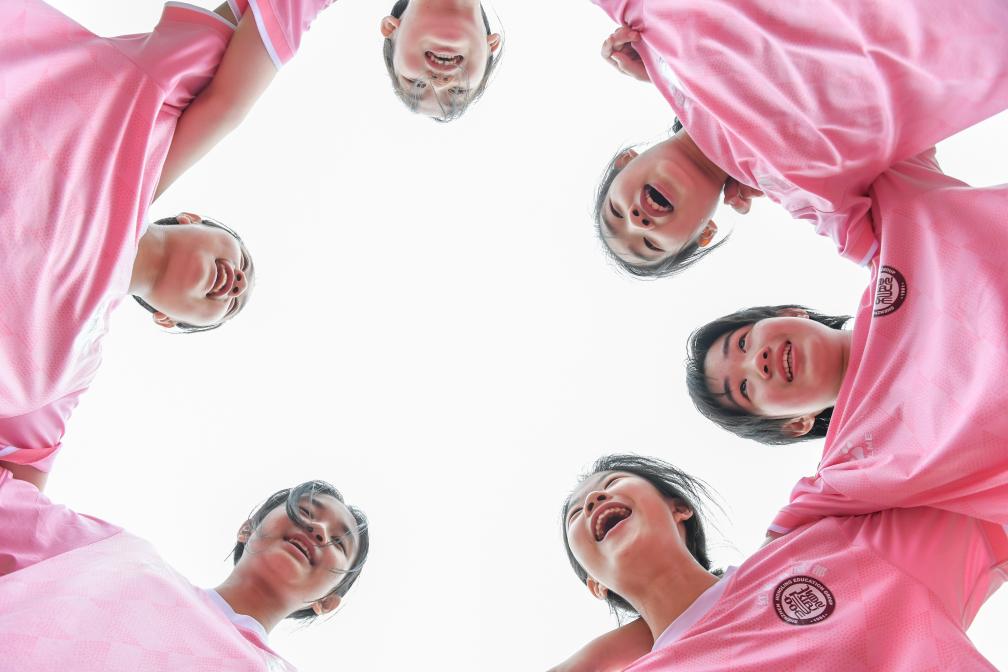 5月11日,練昱彤(左上)在深圳市紅嶺中學(xué)石廈初中部參加校隊(duì)訓(xùn)練賽時(shí)與隊(duì)友互相加油鼓勁。新華社記者 毛思倩 攝