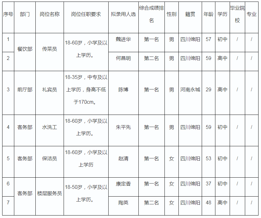 根據(jù)綿陽富樂山九洲國際酒店有限公司發(fā)布的招聘公告及招聘相關(guān)規(guī)定,經(jīng)面試、體檢等程序,錄用魏進(jìn)華等7名同志到客務(wù)部、餐飲部工作,現(xiàn)予以公示,具體情況如下: