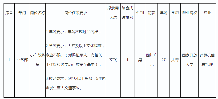 根據(jù)綿陽市汽車實驗駕駛技術(shù)學(xué)校股份有限公司發(fā)布的招聘公告及招聘相關(guān)規(guī)定,經(jīng)面試、實操、考察、體檢等程序,擬錄用文飛同志到綿陽市汽車實驗駕駛技術(shù)學(xué)校股份有限公司工作,現(xiàn)予以公示,具體情況如下: